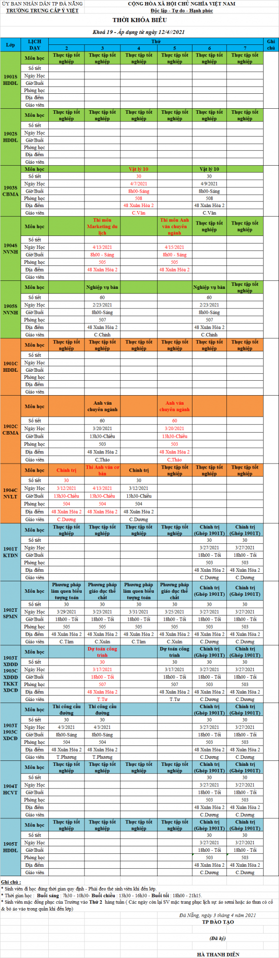 Lịch học khóa 19 - Áp dụng từ này 12/04/2021