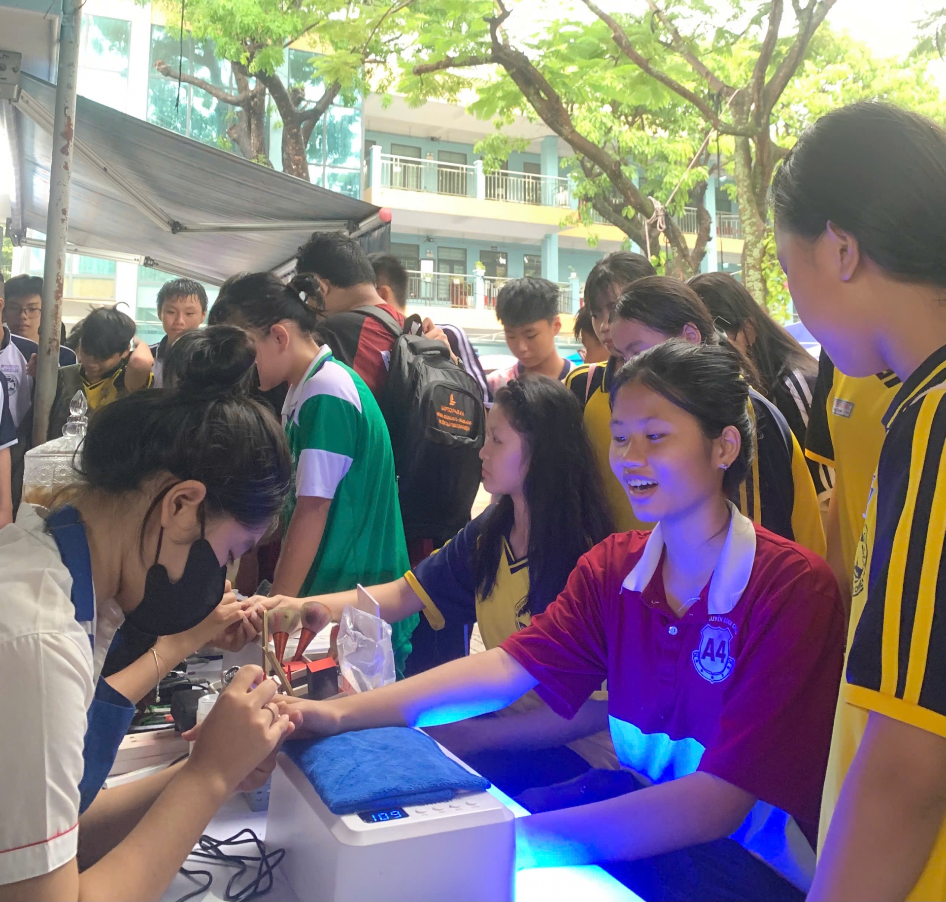Trường Trung cấp Ý Việt mang đến hai gian hàng trải nghiệm về pha chế thuộc ngành nghiệp vụ nhà hàng và chăm sóc sắc đẹp, nhanh chóng trở thành điểm đến được nhiều bạn trẻ yêu thích. Dù trời mưa lớn, nhiều học sinh vẫn kiên nhẫn xếp hàng để thử sức, thực hành trực tiếp và trao đổi cùng giảng viên, sinh viên thực hành của nhà trường. Những nụ cười, ánh mắt háo hức và những chia sẻ chân thành từ các em chính là minh chứng cho sức hút của các hoạt động trải nghiệm.